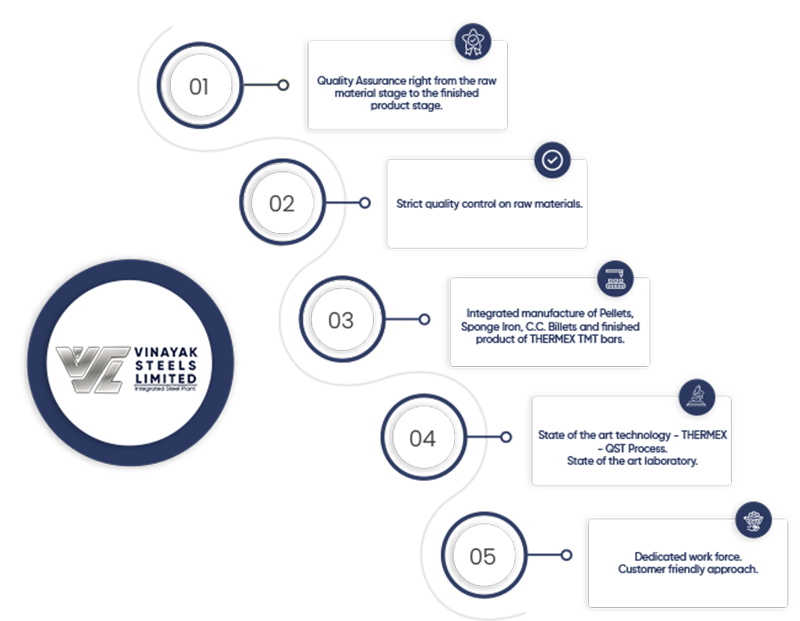 Vinayak Thermex TMT bars have the unique advantage over others because of its strict Quality Assurance Measures.Vinayak Steels Limited is committed to achieve quality excellence.